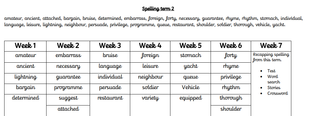 Our spellings for this term are below. However, we are moving away from weekly tests, using more discreet learning techniques, and applying our spelling words across our curriculum.
